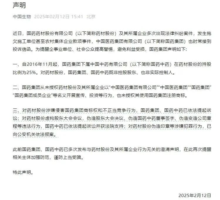 合作期间,国药集团及其控股上市平台 中国中药 曾多次公开声明:药材股份不是其控股或实际控制企业,亦未授权其对外使用“国药集团”的名义开展经营。