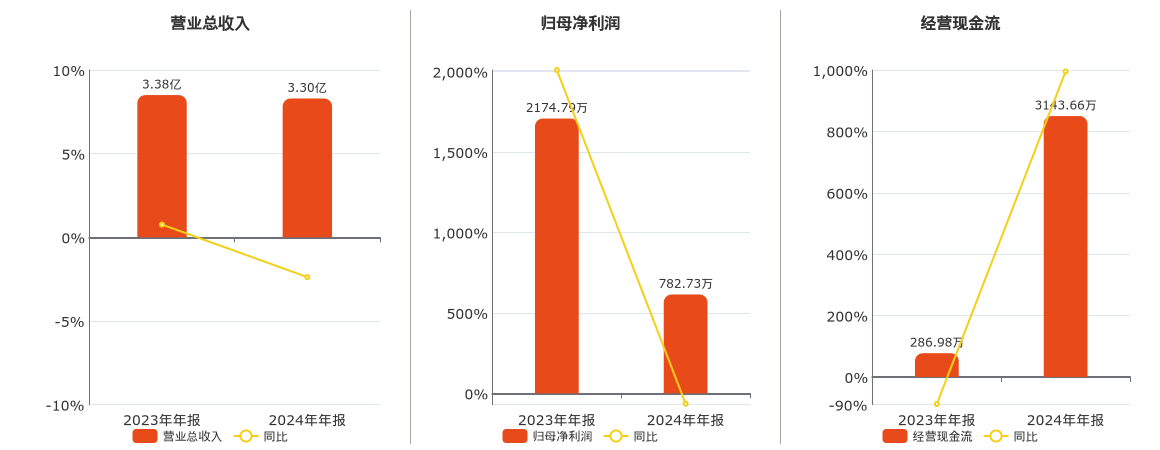 公司营业总收入为3.30亿元,较去年同报告期营业总收入减少805.05万元,同比较去年同期下降2.38%。归母净利润为782.73万元,较去年同报告期归母净利润减少1392.06万元,同比较去年同期下降64.01%。经营活动现金净流入为3143.66万元。