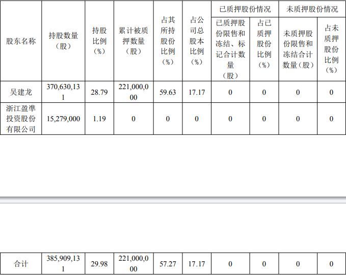 截至预案签署日,吴建龙直接持有上市公司28.79%的股份,并通过其控制的浙江盈凖投资股份有限公司间接控制上市公司1.19%的股份,合计控制上市公司29.98%的股份,为上市公司的控股股东。上市公司的实际控制人为吴建龙,浙江盈凖投资股份有限公司为一致行动人。