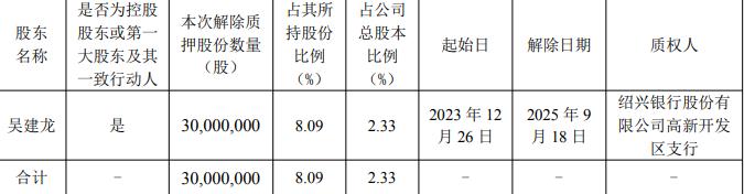 公司9月19日披露关于股东部分股份解除质押的公告,公司于近日接到股东吴建龙通知,吴建龙将所持有公司部分股份办理解除质押业务,本次解除质押股份数量30,000,000股,占公司总股本比例2.33%,解除日期2025年9月18日。截至公告披露日,吴建龙及其一致行动人所持质押股份385,909,131股,累计被质押数量221,000,000股,占公司总股本比例17.17%。