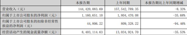 据公司2025年半年报,报告期内,公司实现营业收入1.44亿元,同比减少8.33%;归属于上市公司股东的净利润116.07万元,同比减少35.68%;扣除非经常性损益后的净利润4.48万元,同比减少94.46%;经营活动产生的现金流量净额840.31万元,同比减少35.53%。