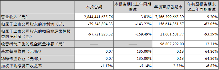 单季度来看,长盈精密今年第三季度实现营业收入28.44亿元,同比增长3.83%;实现归属于上市公司股东的净利润-7934.88万元,同比下降143.22%;实现归属于上市公司股东的扣除非经常性损益的净利润-9772.18万元,同比下降159.49%;加权平均净资产收益率为-1.17%,较上年同期减少5.14个百分点。