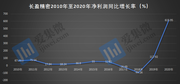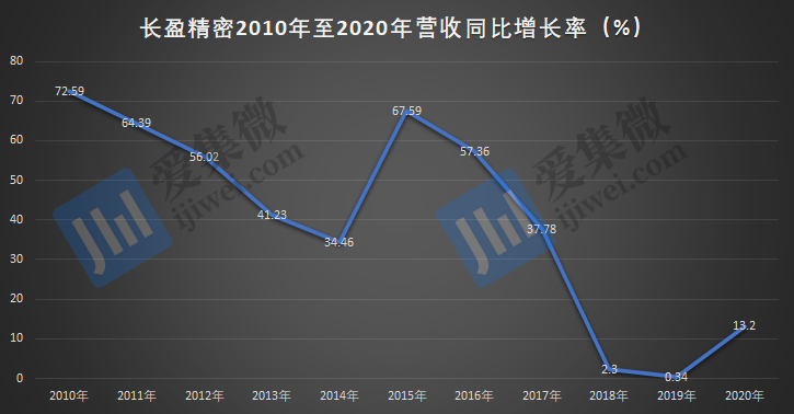 然而,通过纵向对比发现,在连续7年高速增长后,2017年以来长盈精密业绩的增幅就已颓势尽显。根据财报,2018年至2019年,其营收同比增幅仅有2.3%和0.34%,2020年也只有13.2%,几乎连续三年都在原地踏步。