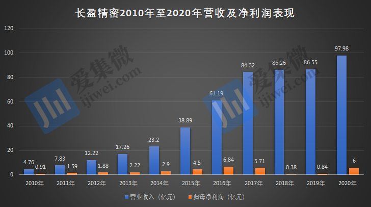 首先简要回顾一下长盈精密近十年来的业绩情况。根据此前公告,2010年至2020年,分别实现营业收入4.76亿元、7.83亿元、12.22亿元、17.26亿元、23.2亿元、38.89亿元、61.19亿元、84.32亿元、86.26亿元、86.55亿元、97.98亿元;归母净利润0.91亿元、1.59亿元、1.88亿元、2.22亿元、2.9亿元、4.5亿元、6.84亿元、5.71亿元、0.38亿元、0.84亿元、6亿元。