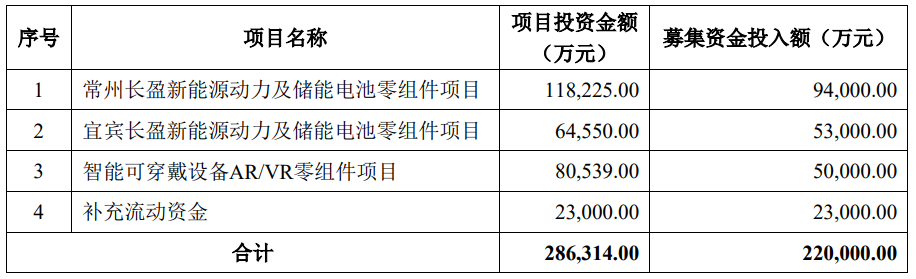 公告显示,本次增发拟投资的“常州长盈新能源动力及储能电池零组件项目”和“宜宾长盈新能源动力及储能电池零组件项目”拟分别投资11.82亿元和6.45亿元,拟使用募集资金分别为9.4亿元和5.3亿元,项目建成达产后将显著提升公司新能源业务的生产能力,为公司带来更多的经济利益。