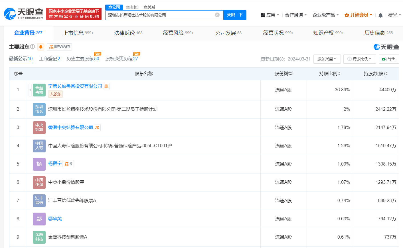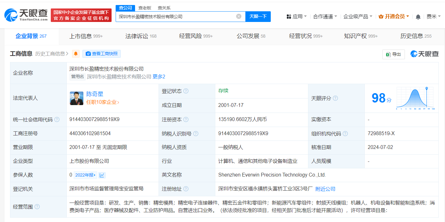 深圳市长盈精密技术股份有限公司成立于2001年7月,法定代表人为陈奇星,经营范围为研发、生产、销售精密模具、精密电子连接器件、精密五金件和零组件、新能源汽车零组件、射频天线模组、消费类电子产品等,由宁波长盈粤富投资有限公司、香港中央结算有限公司等共同持股。