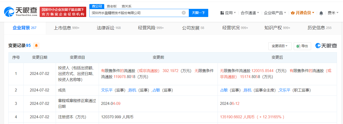 近日,长盈精密(300115)发生工商变更,注册资本由约12.04亿人民币增至约13.52亿人民币。