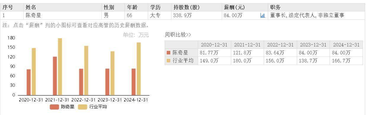 长盈精密的董事长陈奇星,在过去的两年(2023-2024年)中,年薪均为84万元,未有涨幅。陈奇星出生于1959年,拥有中国国籍和大专学历。他的职业生涯包括在深圳市南山区粤海实业公司担任部门经理,以及在长盈投资和深圳市海鹏信息电子股份有限公司担任董事等职位。