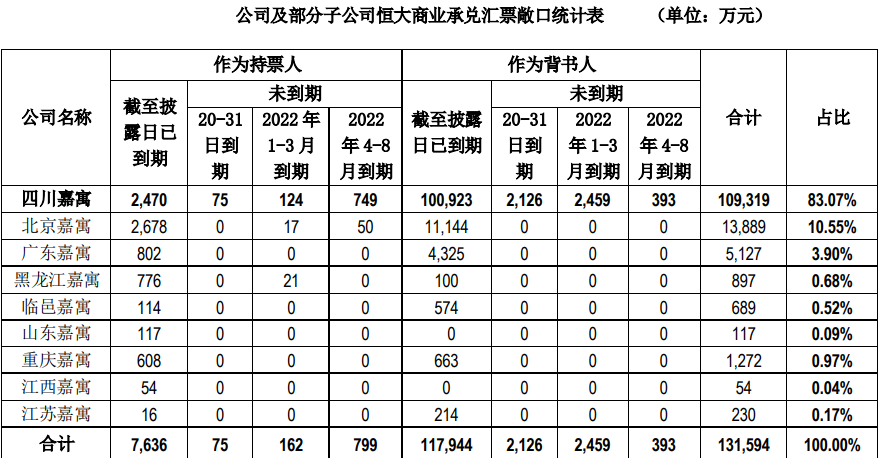 日前,嘉寓股份发布关于商业承兑汇票的风险提示性公告显示,嘉寓股份及部分子公司涉及恒大商业承兑汇票的持票或背书,合计商票敞口金额为13.16亿元,其中,子公司四川嘉寓涉及的金额最高,为10.93亿元,占比83.07%。