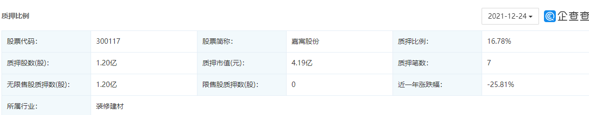 嘉寓股份共有75次股权质押记录,其中嘉寓集团达69次。质押股数为1.20亿股,质押比例为16.78%,质押市值4.19亿元。