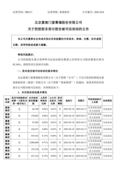 2月22日,北京嘉寓门窗幕墙股份有限公司(300117.SZ)发布公告称,嘉寓股份于近日收到控股股东嘉寓新新投资(集团)有限公司的通知,获悉其所持有的部分公司股份被司法冻结,本次被司法冻结约456.59万股,占公司总股本的0.64%。