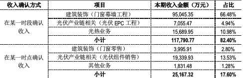 其中,针对建筑装饰(门窗幕墙工程)、光伏产业链相关(光伏EPC 工程)、光热业务这三大板块,采用“在某一时段确认收入”,2021年收入金额约为11.78亿元,占总营收的82.4%。