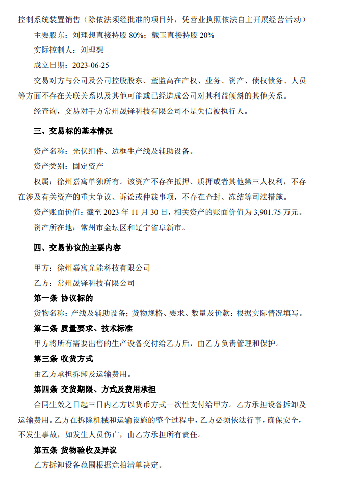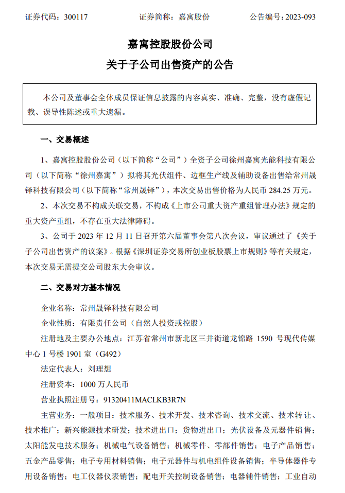 日前,嘉寓股份发布公告宣布,全资子公司徐州嘉寓光能科技有限公司拟将其光伏组件、边框生产线及辅助设备出售给常州晟铎科技有限公司,本次交易出售价格为人民币 284.25 万元。