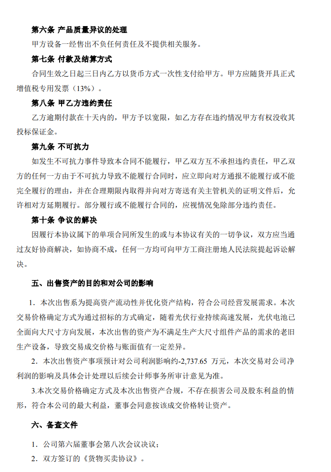 嘉寓股份表示,本次出售系为提高资产流动性并优化资产结构,符合公司经营发展需求。本次交易价格确定方式为通过招标的方式确定,随着光伏行业持续高速发展,光伏电池已全面向大尺寸方向发展,本次出售的资产为不满足生产大尺寸组件产品的需求的老旧生产设备,导致交易成交价格与账面值有一定差异。