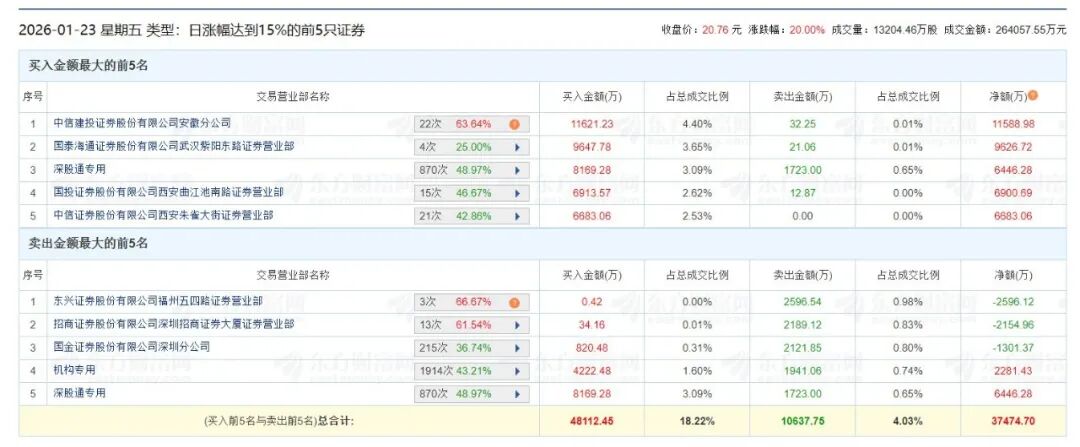 1月23日,证券营业部前五席位净买入超4.8亿元。其中,买入前一席位被中信建投安徽分公司占据,当日买入金额高达1.16亿元。据雪球股友透露,这是市场熟知顶级游资“拉萨天团”和陈小群的关联席位之一;