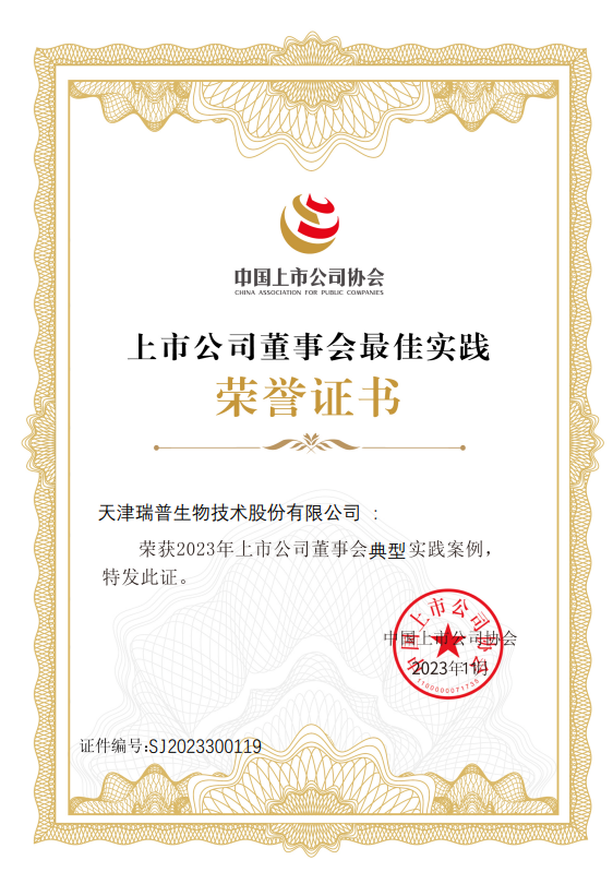 瑞普生物以打造领先十年的管理体系为目标,加强顶层制度设计,厘清股东大会、董事会、总经理三级职责,形成权责法定、权责透明、协调运转、有效制衡的公司治理机制,今年荣获中国上市公司协会“2023年上市公司董事会典型实践案例”奖项。