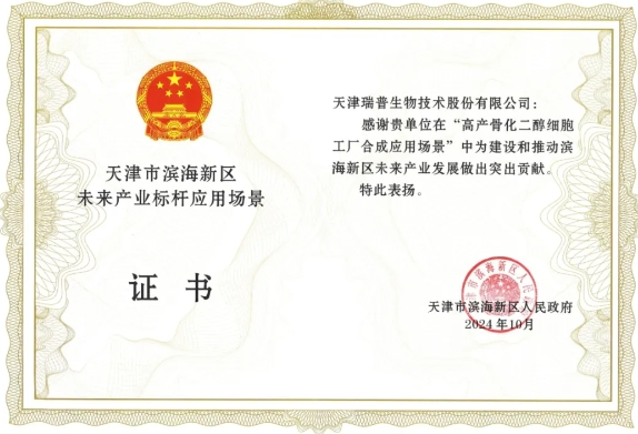 2024年10月,瑞普生物“高产骨化二醇细胞工厂合成”项目,被天津市滨海新区人民政府评选为“2024年度天津市滨海新区未来产业标杆应用场景”。