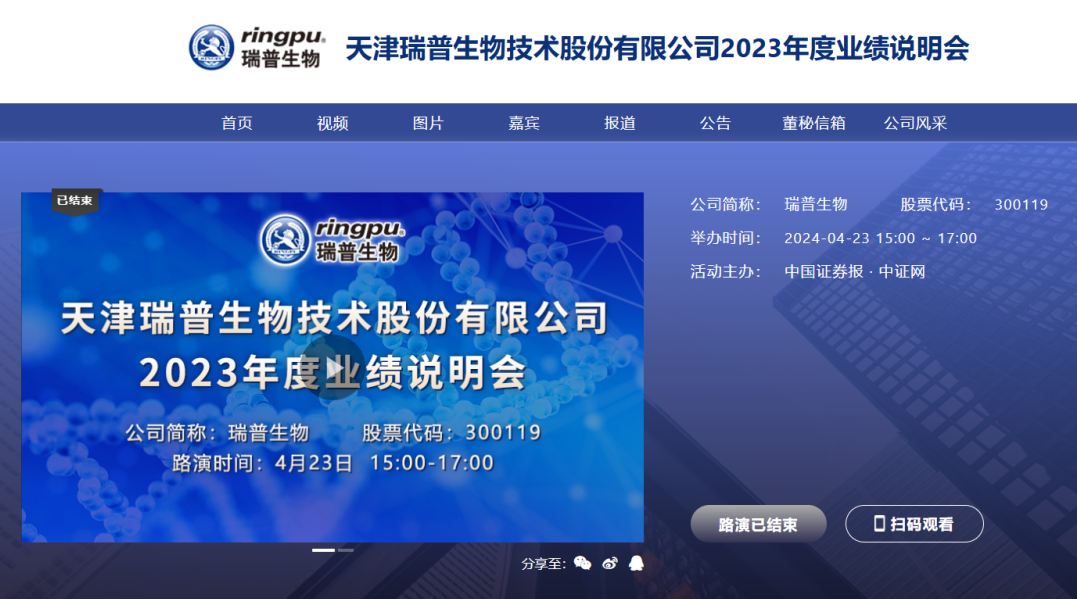 2024年4月23日,瑞普生物2023年年度业绩说明会在中国证券报·中证网路演中心举行,董事长及管理团队通过现场+视频直播的方式与投资者、行业分析师、媒体记者面对面,汇报2023年度公司在战略执行、经营发展、研发创新及投资者回报等方面的成果,并就投资者关心的问题进行充分地交流。
