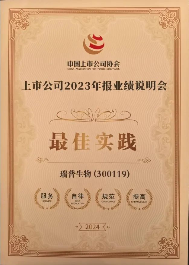 为深入贯彻新“国九条”中提出的“金融为民”理念,坚持以人民为中心的发展思想,有效保护投资者的合法权益,切实提升上市公司投资者关系管理水平,中上协自2021年起开展上市公司年报业绩说明会最佳实践评估工作。今年,中上协经对全市场上市公司召开年报业绩说明会情况总结,与各地证监局、沪深北交易所及投服中心充分沟通交流,综合形成100家“2023年报业绩说明会最佳实践”和366家“2023年报业绩说明会优秀实践”上市公司名单,其中创业板仅有5家上市公司入选最佳实践。瑞普生物荣幸名列最佳实践案例,成为展现上市公司与投资者沟通互动、价值传递新实践的典范。