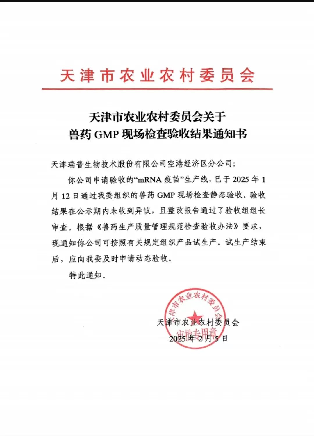 2025年1月8日“mRNA 疫苗生产线”正式列入兽用生物制品类GMP生产线名录,瑞普生物成为国内率先以“mRNA疫苗生产线”申请GMP验收的企业之一。动物用 mRNA 疫苗正逐步实现从实验室到生产线的跨越,迈向产业化发展的新征程。