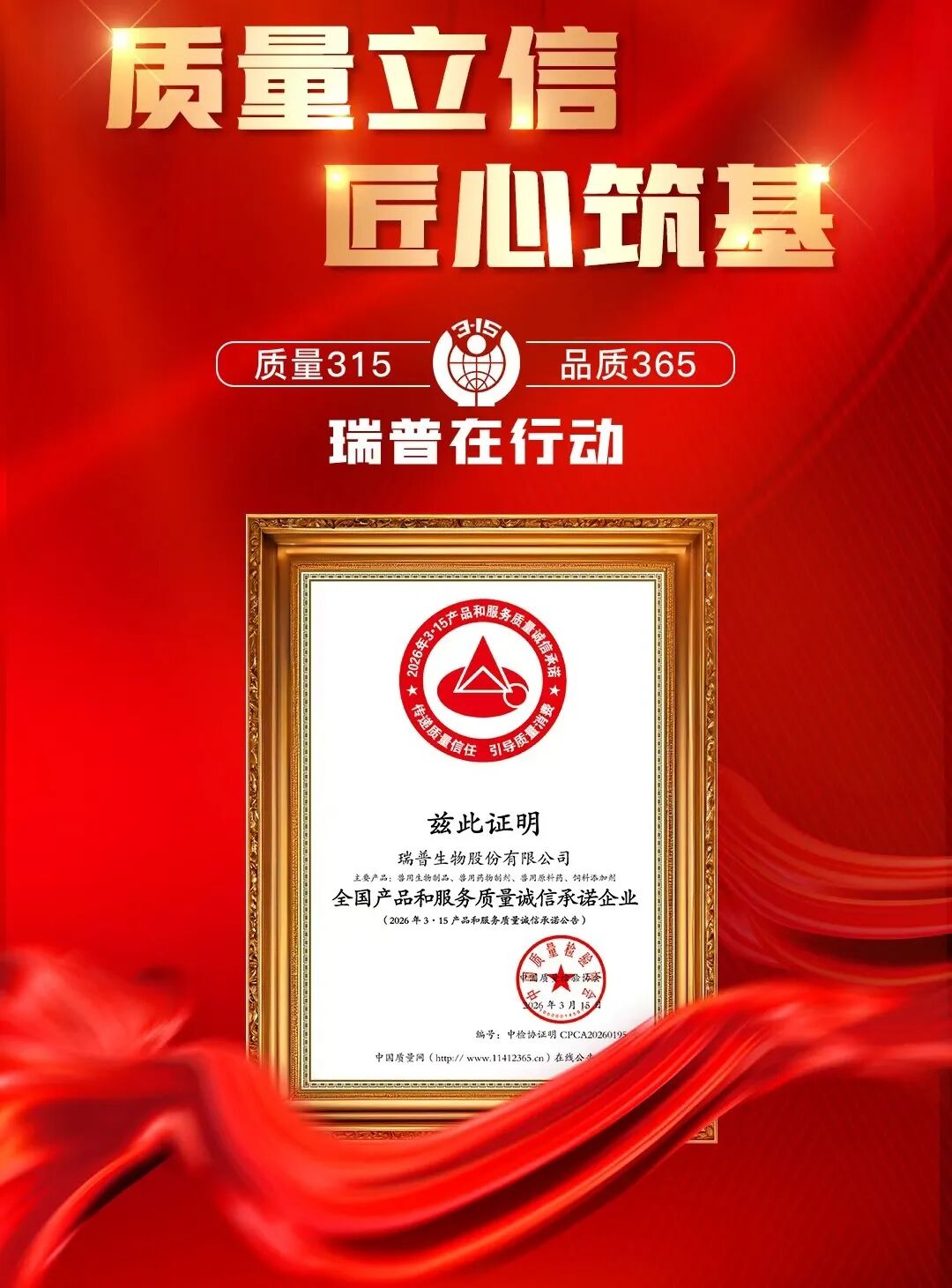 并且在今年"3·15国际消费者权益日"期间,瑞普生物荣获"全国产品和服务质量诚信承诺企业"称号,由2026年3·15产品和服务质量诚信承诺活动组委会正式授予。这一荣誉是对瑞普生物多年来坚守质量底线、践行诚信经营的权威认可,也是公司向广大客户和消费者作出的郑重承诺——质量315,品质365,瑞普始终在行动。