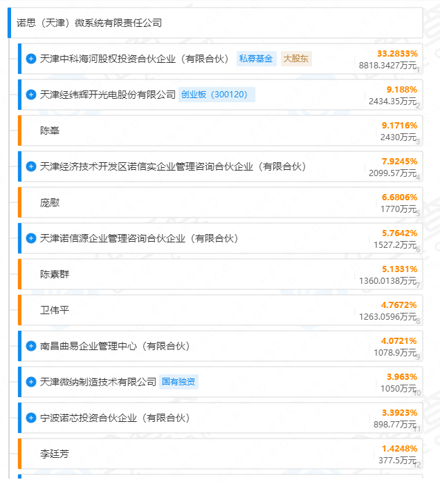 另据数据显示,在股权架构方面,天津中科海河股权投资合伙企业(有限合伙)是诺思第一大股东,持股比例为33.2833%;A股上市公司经纬辉开持有诺思9.1880%股权,其他股东持股比例则从9.1716%至0.1089%不等。