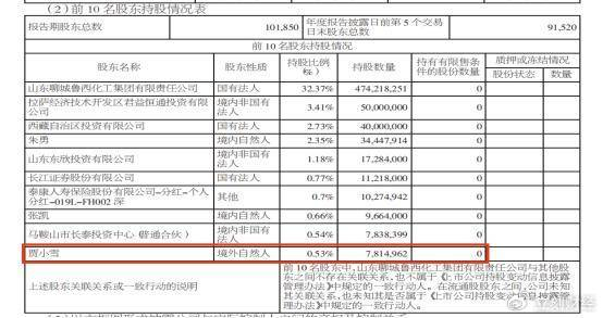 值得关注的是,早在2013年,贾小雪还曾出现在聊城当地上市公司 鲁西化工 的前十大股东名单当中, 鲁西化工 当时的披露显示,贾小雪为境外自然人。