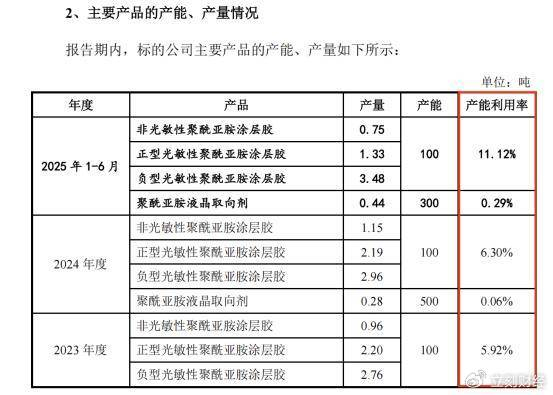 报告披露的数据显示,波米科技主要产品在2023年和2024年的产能利用率只有5.92%和6.30%,其中聚酰亚胺液晶取向剂500吨的实际产能在2023年仅生产了0.28吨,产能利用率只有0.06%。