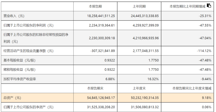 智飞生物发布的2024年上半年报告显示,报告期内,该公司实现营业收入182.58亿元,较上年同期下降25.31%;实现归属于上市公司股东的净利润22.34亿元,较上年同期下降47.55%;实现归属于上市公司股东的扣除非经常性损益的净利润22.30亿元,较上年同期下降47.04%。