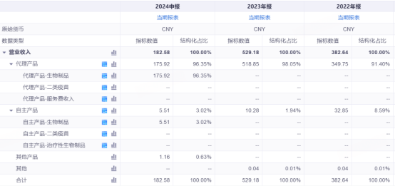 今年上半年公司代理产品的收入占总营收的96.35%,而自主产品仅占总营收的3.02%,近三年基本都是如此。