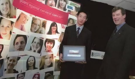 2006年人类第一支宫颈癌疫苗(HPV疫苗)接种现场,周健的儿子周子晞代表父亲到场。