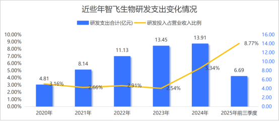 智飞生物的研发投入强度长期较低,2024年之前仅在3%左右。2024年开始虽然研发占比上升至5%以上,可其整体研发投入上升并不多,更多则是因为营收下降所致。即便是2025年前三季度其研发占比已经超过8%,但相比沃森生物、康泰生物等同行10%以上的研发占比仍显逊色不少。