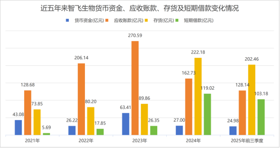 截至2025年三季度末,智飞生物存货规模高达202.46亿元,占总资产比例超40%,应收账款达128.14亿元,两者合计约330亿元,是当期76.27亿元营收的4倍以上。而公司货币资金仅24.98亿元,而短期借款高达103.18亿元,短期偿债缺口巨大。