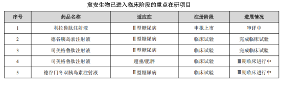 而在治疗领域,智飞生物也在积极布局。尤其是通过控股宸安生物切入代谢类疾病赛道,完成从“防未病”到“治已病”的延伸,其中利拉鲁肽注射液处于申报上市阶段,德谷胰岛素注射液及司美格鲁肽注射液(降糖)已完成临床试验,司美格鲁肽注射液(减重)处于Ⅲ期临床试验。
