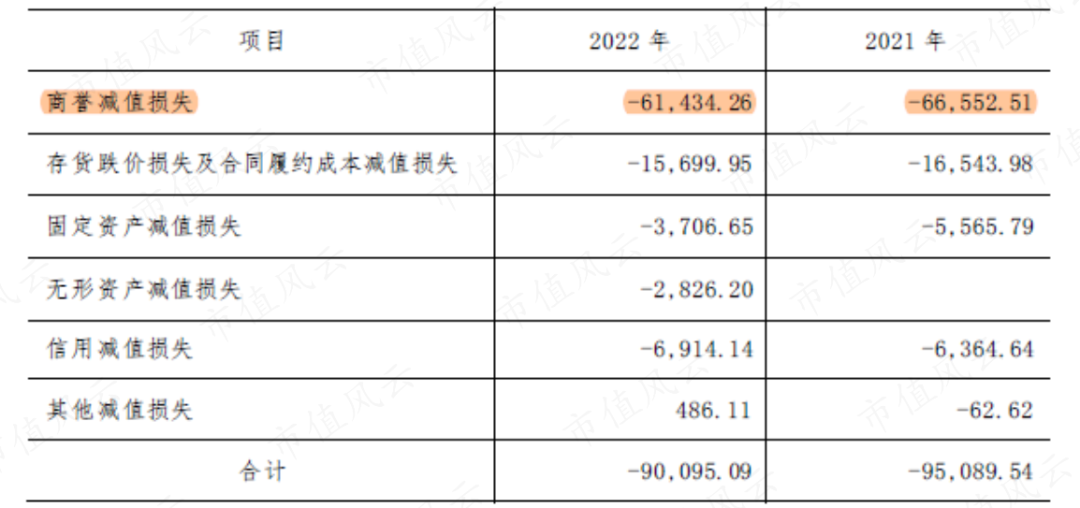 业绩暴雷的主因,是商誉减值损失,2021年、2022年分别为-6.66亿元、-6.14亿元。