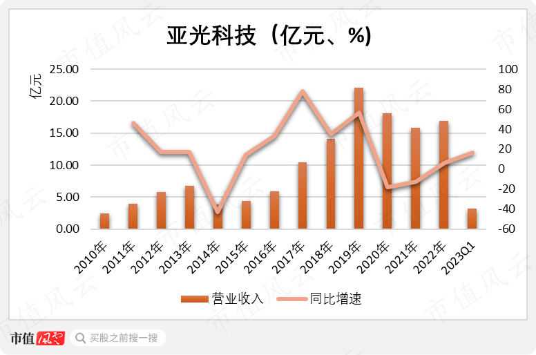 2022年,亚光科技实现营业收入16.86亿元,与2019年的22.06亿元相差甚远。