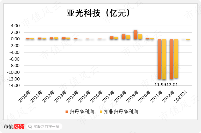 2021年、2022年,亚光科技的归母净利润分别亏损了11.99亿元、12.01亿元,合计高达24亿元。