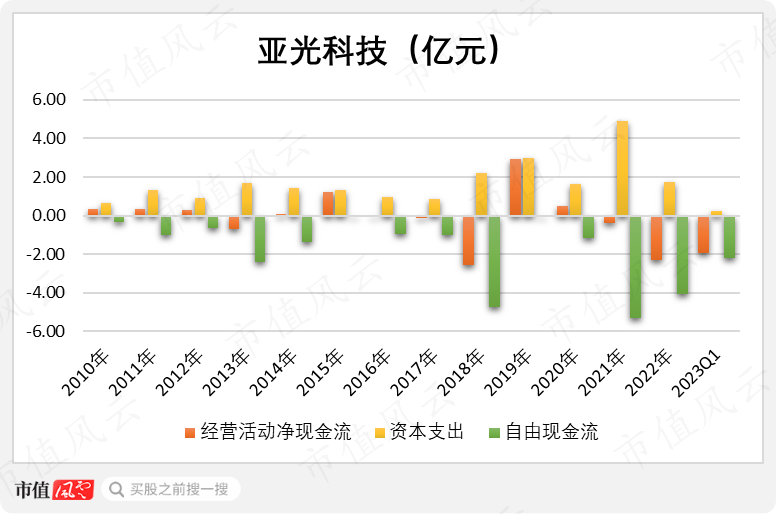 2010年上市至今,亚光科技的自由现金流一直未流出状态,合计烧掉了超23亿元。