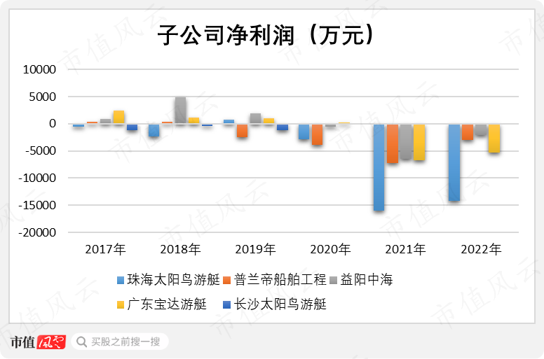 几家负责船艇业务的子公司,2017年以来不间断亏损,到2021年以全部沦为大幅亏损,并将亏损持续至2022年。