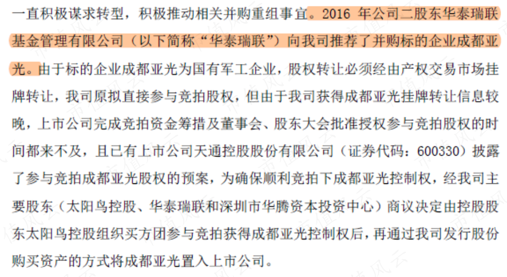 根据2019年年报问询函回复,2016年,当时的二股东华泰瑞联向其推荐了正在挂牌等待竞拍的亚光电子。