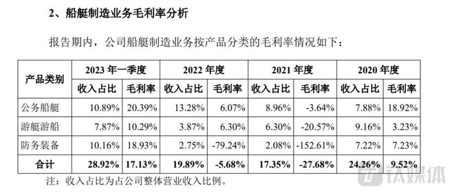 同时,该业务的毛利率波动较大,2020年-2023年上半年,公司船艇制造业务毛利率分别为9.52%、-27.68%、-5.68、10.19%,船艇制造业务曾在2021年和2022年出现亏损情况。