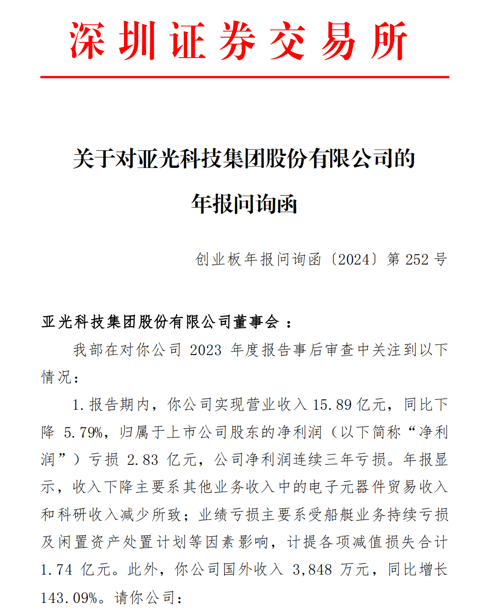 5月28日,亚光科技收到深交所创业板管理部问询函,据了解亚光科技2023年报披露,报告期内,公司实现营业收入15.89亿元,同比下降5.79%,归属于上市公司股东的净利润亏损2.83亿元,公司净利润连续三年亏损。年报显示,收入下降主要系其他业务收入中的电子元器件贸易收入和科研收入减少所致;业绩亏损主要系受船艇业务持续亏损及闲置资产处置计划等因素影响,计提各项减值损失合计1.74亿元。此外,公司国外收入3,848万元,同比增长143.09%。要求公司: