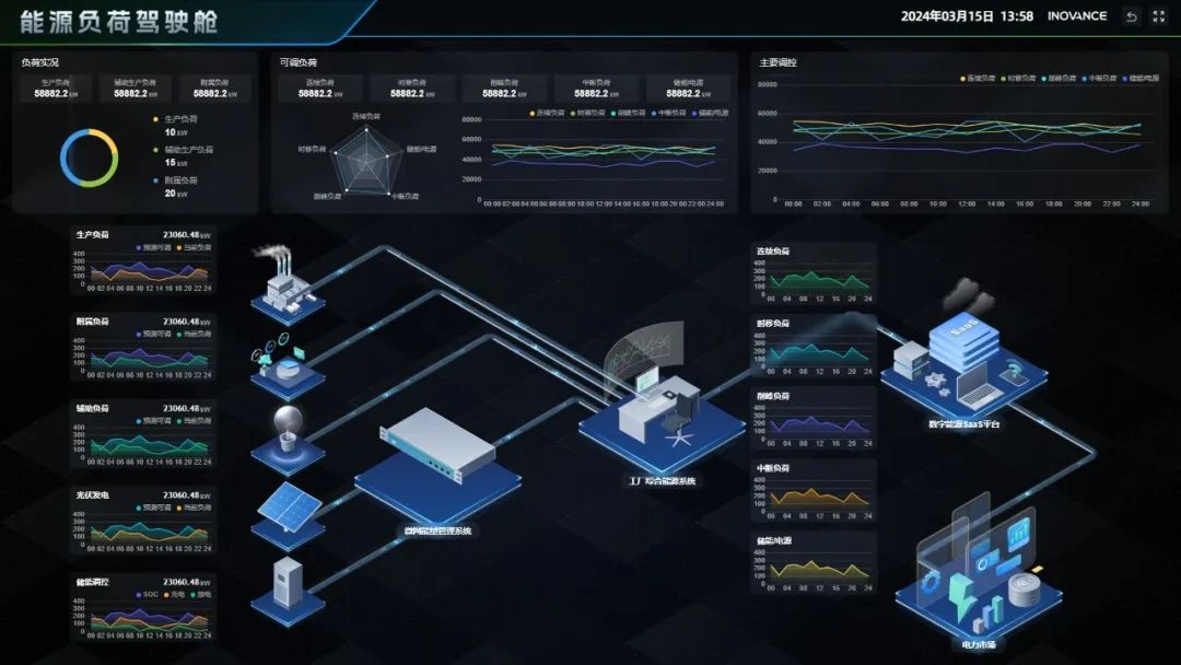 在某汽车制造企业,汇川技术为其提供了一项创新型能源解决方案:将超过10种厂务系统整合到一个数字化能源插座平台上,通过建立能源协同模型和智能排程的结合运用,优化能源消耗,提高生产效率。该方案不仅有效支持了电力市场交易,显著降低购电成本,还大幅提升厂区内的自动化管理水平和节能效果。例如,空压系统节能率达11%,空调节能率达10%,照明节能率达40%。通过智能负荷管理,成功降低了尖峰时段的电费成本1.23%。