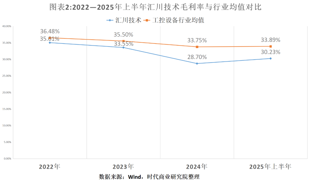 数据显示,如图表2所示,2022—2025年上半年,汇川技术的毛利率分别为35.01%、33.55%、28.70%、30.23%。同期,其所处的工控设备(申万三级)行业毛利率分别为36.48%、35.50%、33.75%、33.89%,持续高于汇川技术。从单个企业来看,汇川技术的毛利率处于行业中下水平。