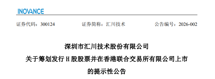 据彭博消息,来自深圳的A股上市公司、工业机器人制造商汇川技术(300124.SH)于周一(1月19日)发布公告,为深入推进公司国际化战略落地,提升公司国际品牌形象及在全球市场的综合竞争实力,借助国际资本市场拓宽多元化融资渠道,助力公司提升整体竞争力并实现高质量发展,公司正在筹划境外发行股份(H股)并在香港联合交易所有限公司上市。