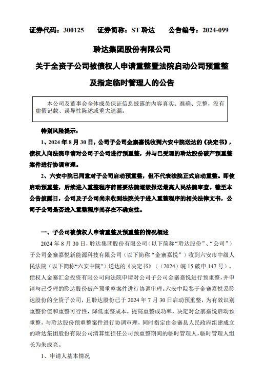 9月2日,ST聆达公告称,2024年8月30日,公司子公司金寨嘉悦收到六安中院送达的《决定书》,债权人向法院申请对公司子公司进行预重整,并与已受理的聆达股份破产预重整案件进行协调审理。
