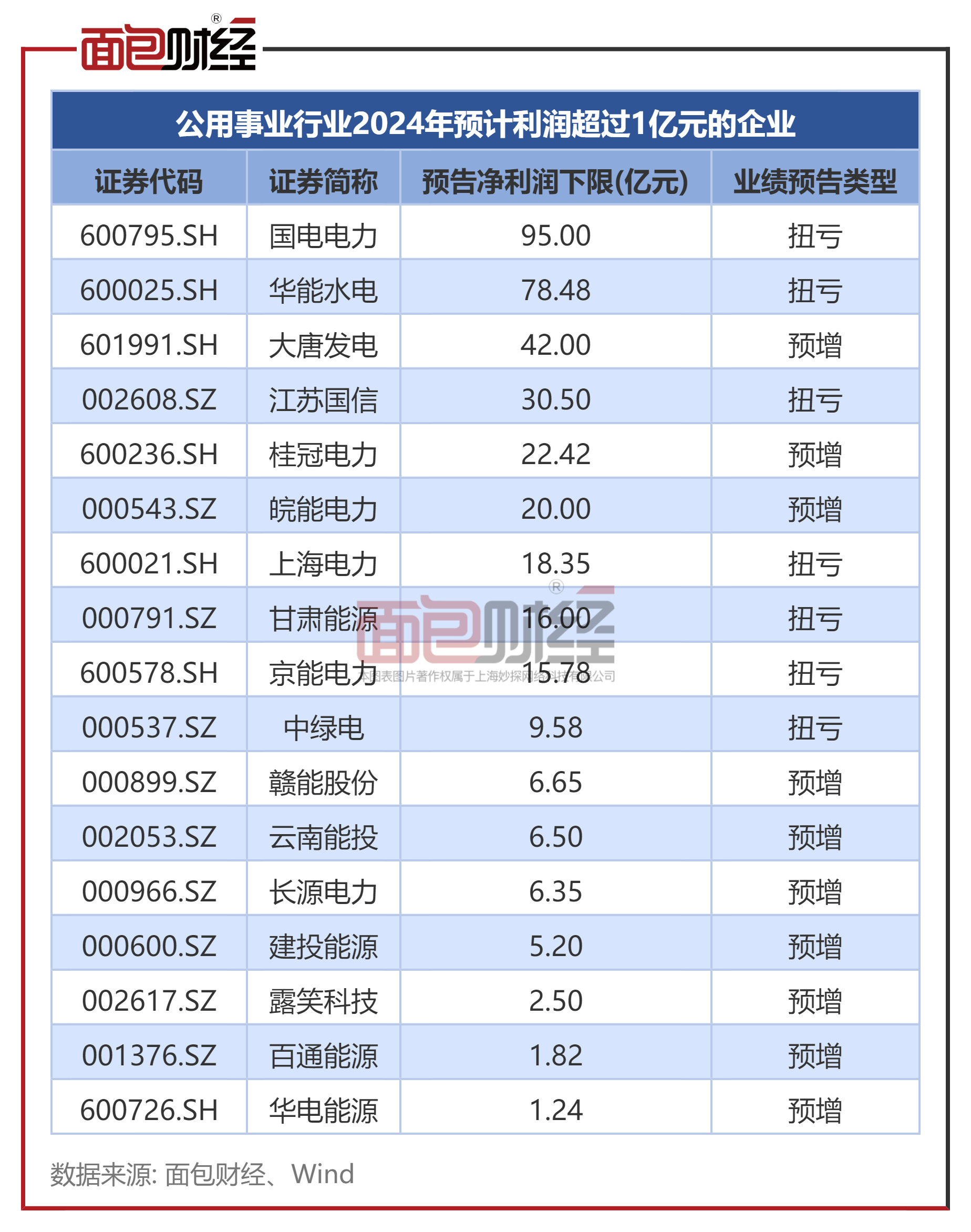 国电电力、华能水电、大唐发电等9家企业预告净利润下限超过10亿元。此外,赣能股份、云南能投等9家企业预告净利润下限超过1亿元。