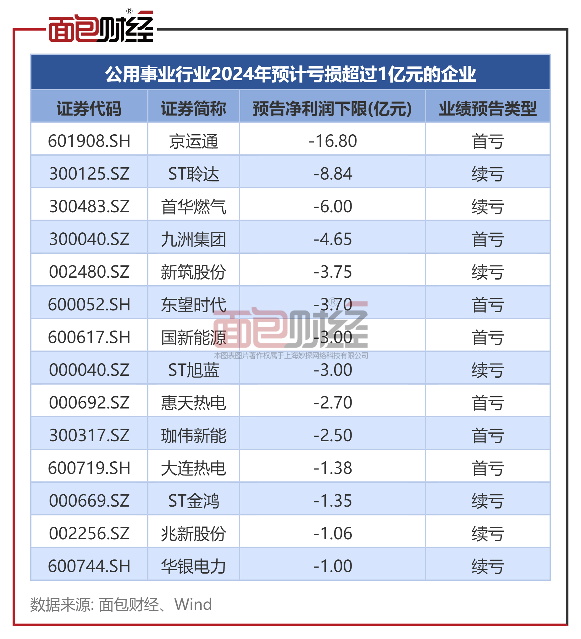 25家公用事业企业业绩亏损或下滑,其中续亏12家、首亏9家。