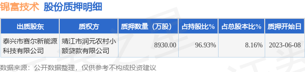 锦富技术(300128)6月9日公开信息显示,股东泰兴市赛尔新能源科技有限公司向靖江市润元农村小额贷款有限公司合计质押8930.0万股,占总股本8.16%。质押详情见下表: