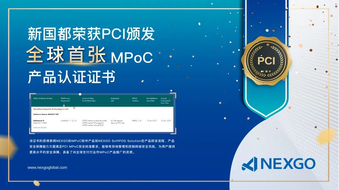 2024年1月23日,新国都NEXGO正式荣获PCI颁发的全球首张 Mobile Payment on COTS(简称“MPoC”)Software产品认证证书。此次认证通过,意味着新国都NEXGO 获得了国际权威机构的高度认可,NEXGO TAP能为用户提供最高世界水平的数据安全保护方案,并具备了面向全球支付行业推广的资质。